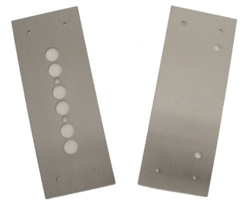 Twee precisie roestvrij stalen platen voor IN16-6-Vx nixie klok. De perfecte afwerking. Deze zware platen zijn met een Laser exact op maat gesneden. De grote gaten voor de buizen hebben een diameter van 13,5mm. Afmetingen: 173mm x 66mm x 2mm. Totaal gewicht 350 gram.
