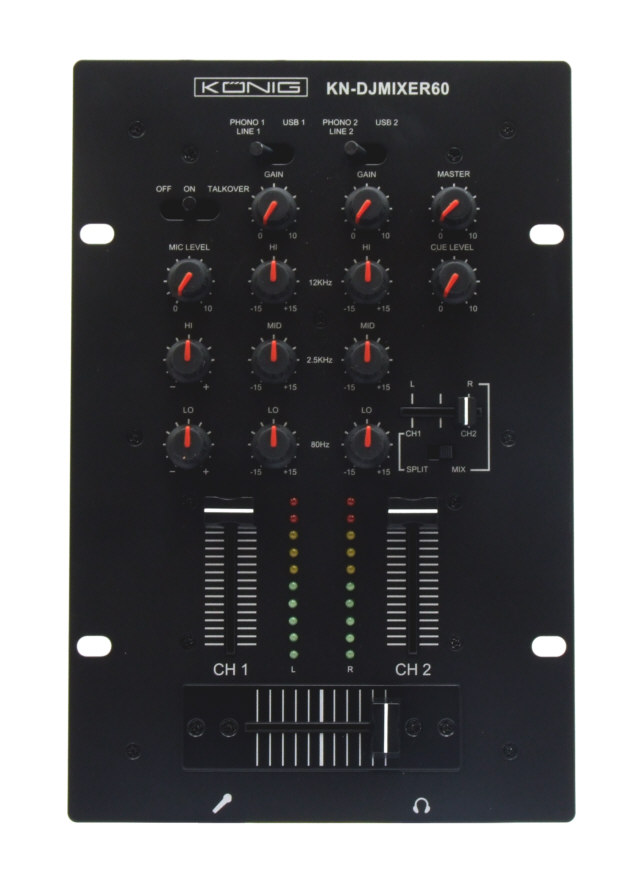 Deze 2-kanaals mixer heeft 2 USB poorten die het mogelijk maken om ook muziek vanaf PC in te mixen. De 3 bands equalizer en de gain zijn per kanaal instelbaar.