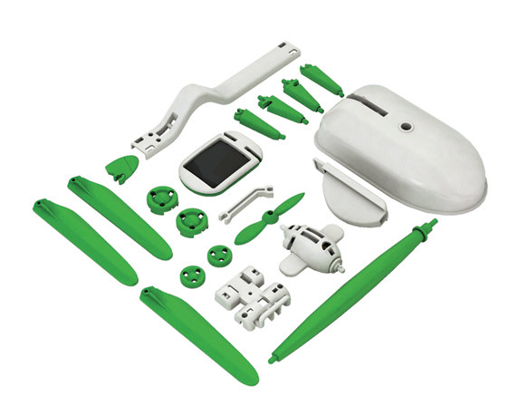 Bouwpakket met zonnepaneel en motortje. Van de onderdelen kun je zes verschillende apparaten maken.